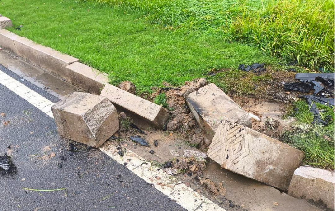 我们配合交警 / 消防 / 保险对事故现场勘察,并结合车辆数据分析,初步确认,车辆在行驶过程中因路面湿滑,驾驶人操作不当,导致车辆冲出车道撞向隔离花坛区。车辆前杠和底盘区域撞上隔离带周边的连续方形石块(约 28cm*30cm*50cm),撞击导致电池底部严重受损,怀疑电池内部受撞击发生局部短路,出现短时冒烟和明火,并向下泄压。事故发生后消防人员及时介入处置,车辆风险已解除并转移至安全区域。