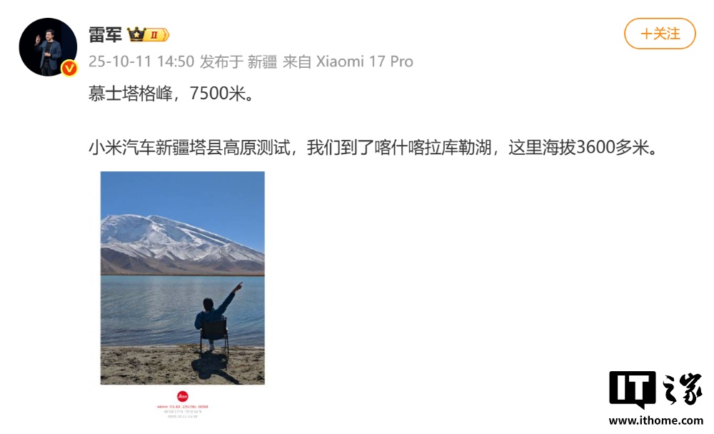 IT之家注意到,除了雷军,小米汽车高级顾问胡峥楠、小米集团副总裁张剑慧、小米汽车产品部总经理于锴等高管的社交媒体账户 IP 属地均显示为新疆,表明他们也参与了此次测试。雷军在社交媒体上发布的合照显示,测试团队在昆仑山脚下集结,且测试内容丰富,包括小米 YU7 高原续航、充电、防晒等项目。此前,小米 SU7 和小米 YU7 发布前,均有高管参与路测,此次雷军等高管的行动,似乎预示着小米 YU9 很快就要来了。
