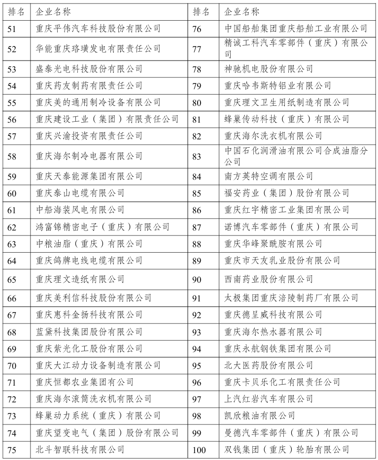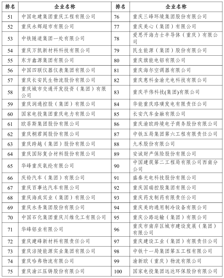 与去年相比,赛力斯、重庆百货、远达环保、民生能源集团、重庆京东方、盛泰光电、哈弗物流、平伟集团、重庆长城汽车、渝欧公司是首次出现在名单中。