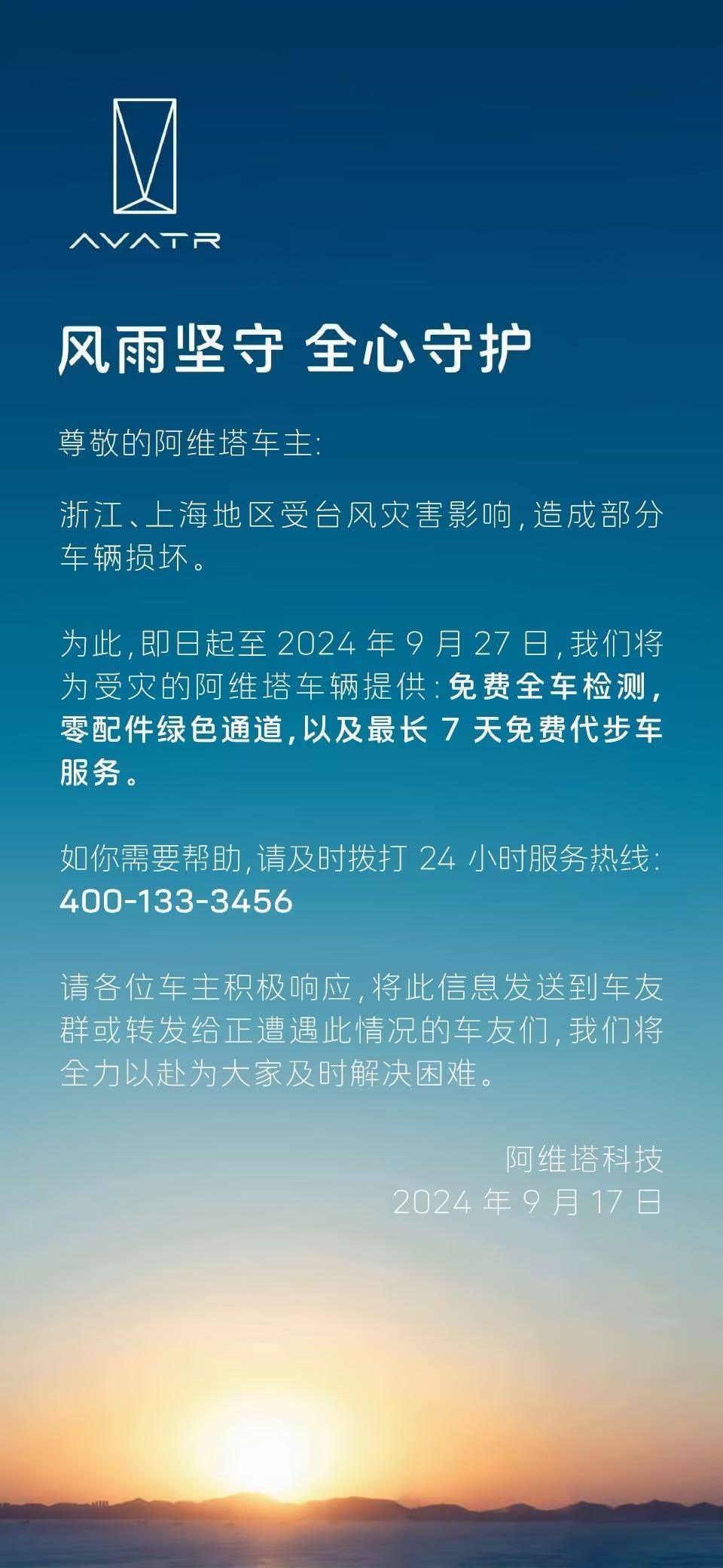 IT之家 9 月 17 日消息,阿维塔科技官方今日发文宣布,开启专项行动,为浙江、上海地区受灾的阿维塔车辆提供免费全车检测、零配件绿色通道,以及最长 7 天免费代步车三项服务。