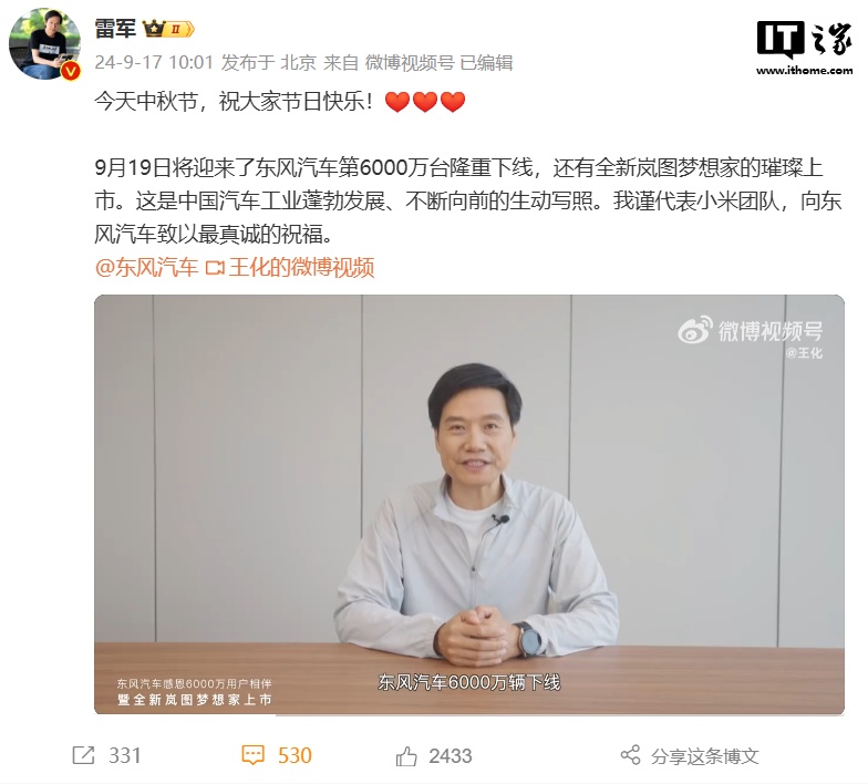 IT之家 9 月 17 日消息,小米创办人、董事长兼 CEO 雷军今日发布微博,对即将到来的东风汽车第 6000 万台下线送上祝贺,并祝全新岚图梦想家正式发布。