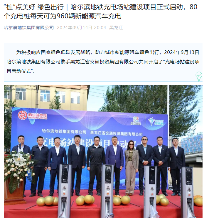 IT之家 9 月 17 日消息,哈尔滨地铁集团有限公司 9 月 13 日携手黑龙江省交通投资集团有限公司共同举行了“充电场站建设项目启动仪式”。