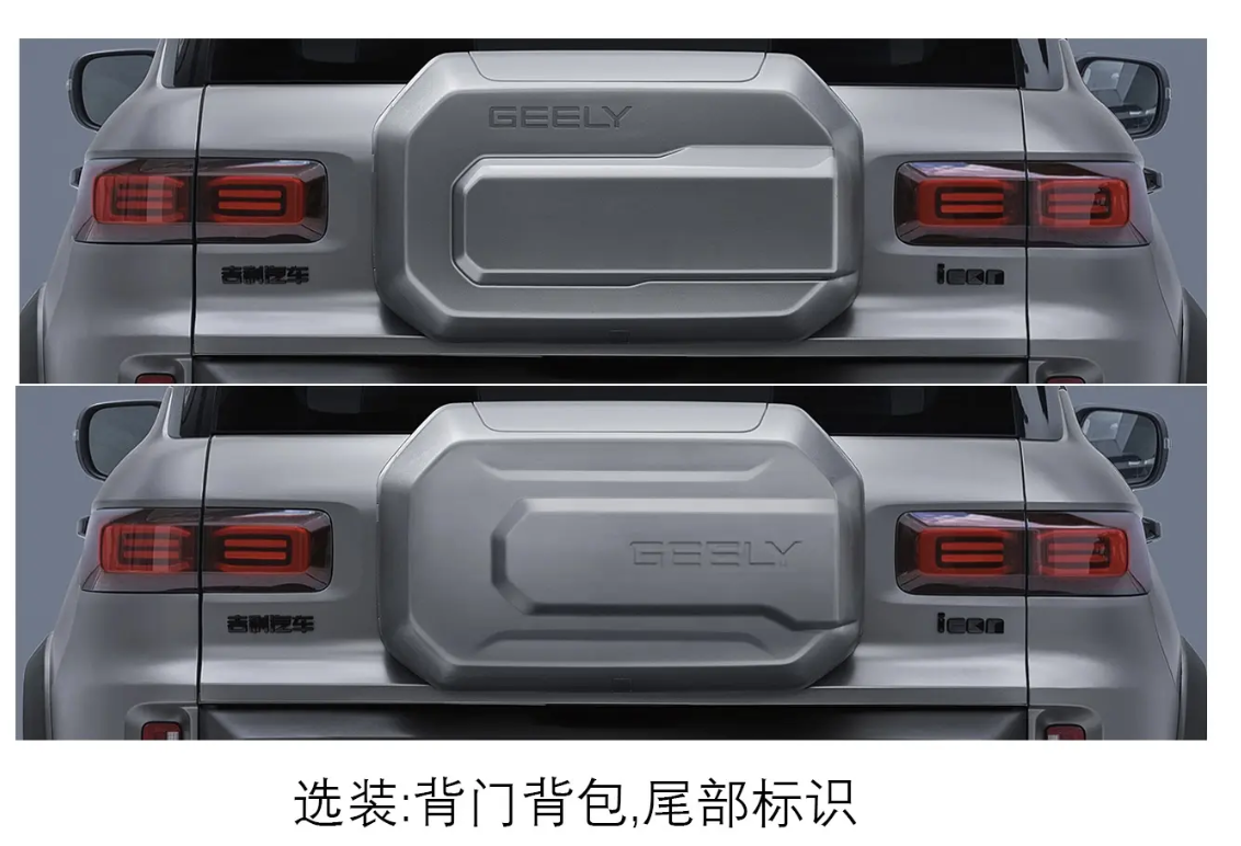 外观方面,工信部显示这一“越野版”车型使用 ICON 玲珑的“發灰”配色,前保险杠方面换用全新硬派风格设计,加入银色下护板以及高亮黑装饰,发动机舱盖前部的吉利图形车标更换为“GEELY”字母标识,尾部拥有两种样式的“小书包”储物装置,尾门两侧的铭牌也变更为黑色。