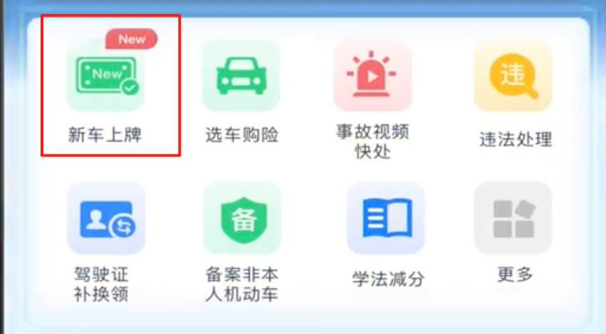 具体到上牌环节是这样子的,进入主界面,点击新车上牌。