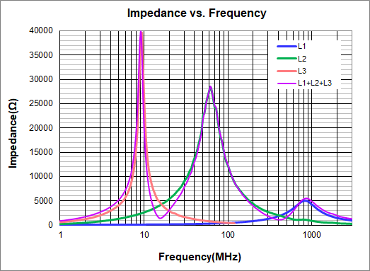 PoC电路中通常包含多个电感器和电阻器组成宽频带滤波器,该频带覆盖GMSL正向和反向通道使用的全部频谱,阻断信号线信号往电源线的流动;确保信号线不会因电源端低阻抗导致的阻抗失配。为了保持信号完整性和良好的信噪比,PoC滤波器要求具有高阻抗,通常为高于1kΩ. 使用多个级联电感可以在整个频段内保持这种高阻抗,如下图: