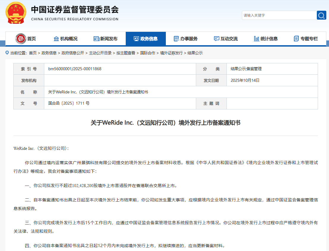 10月14日,证监会发布《关于WeRide Inc.(文远知行公司)境外发行上市备案通知书》,这意味着文远知行回港上市备案正式获批。《通知书》显示,文远知行拟发行不超过102,428,200股境外上市普通股并在香港联合交易所上市。