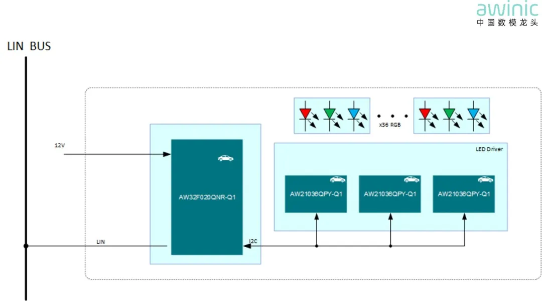 方案特点:支持LIN通讯,支持多颗LED Driver组合显示,单个AW21036支持12颗RGB,单个I²C总线上支持48颗RGB,每个LED最大支持50mA,总体方案低EMI,无啸叫。提供声光律动算法,温度补偿,颜色校准算法。