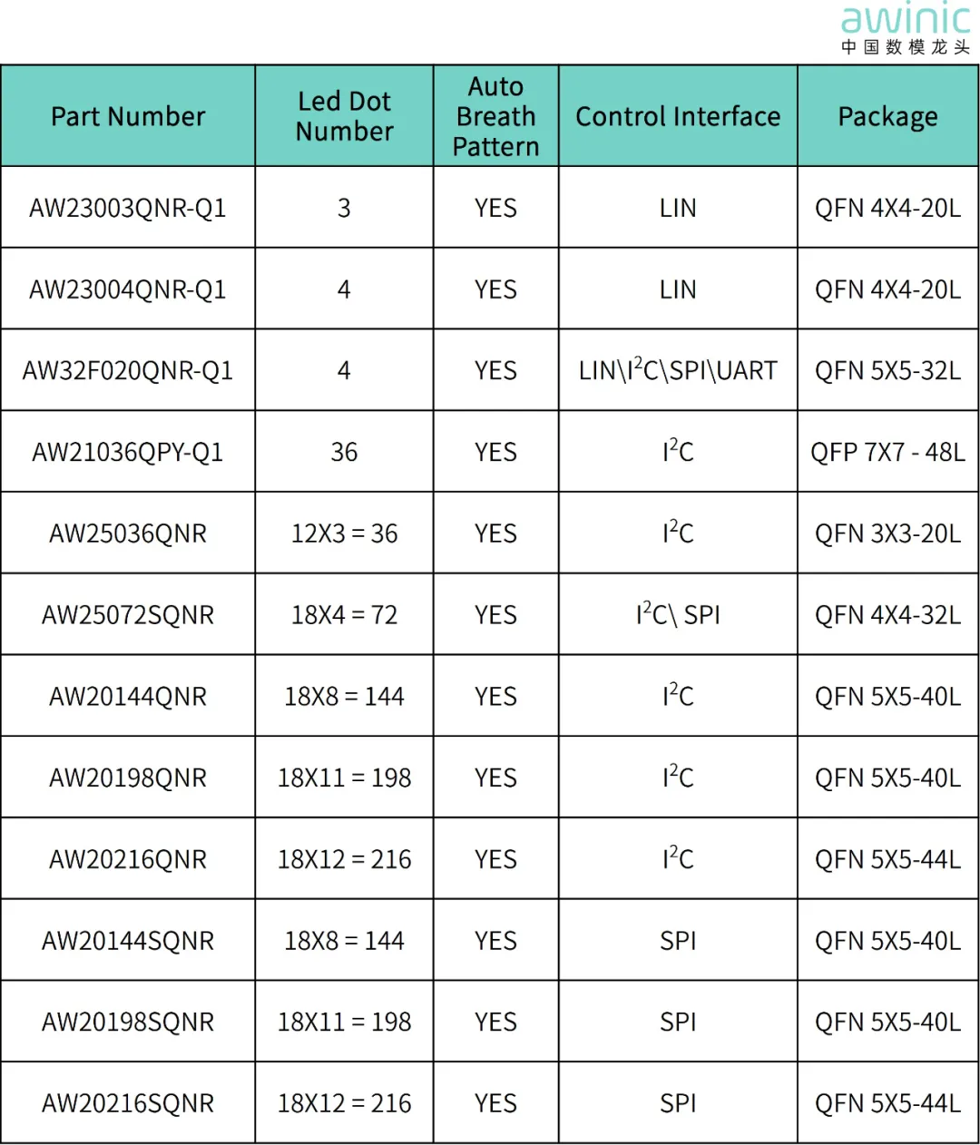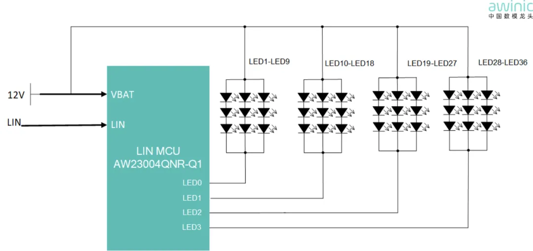 方案特点:AW23004QNR-Q1单路具备最大60mA驱动能力,在12V供电场景下,通常可串联3颗 LED(具体数量需根据LED实际正向节压动态调整)。