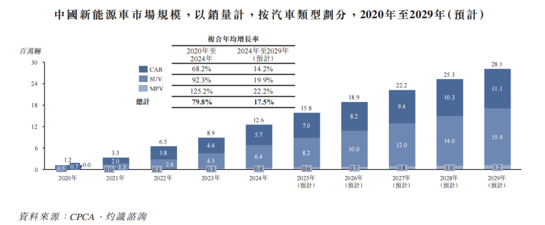 据岚图招股书披露,2024年,全国MPV车型销量仅为40万辆,占全部类型车辆的比重为3.4%。即便是到了2029年,预计MPV销量也仅增长至120万辆,占比上升至4.1%。