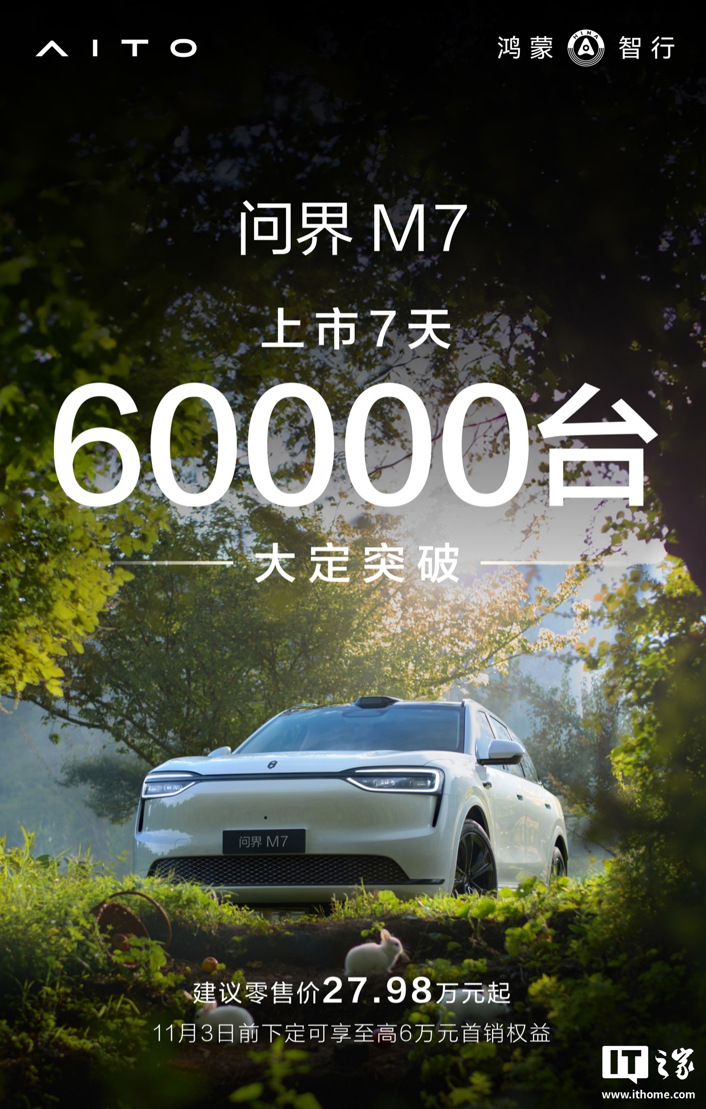 据IT之家此前报道,鸿蒙智行在今年 9 月 30 日午间发布数据:全新问界 M7 上市 7 天大定突破 6 万台。