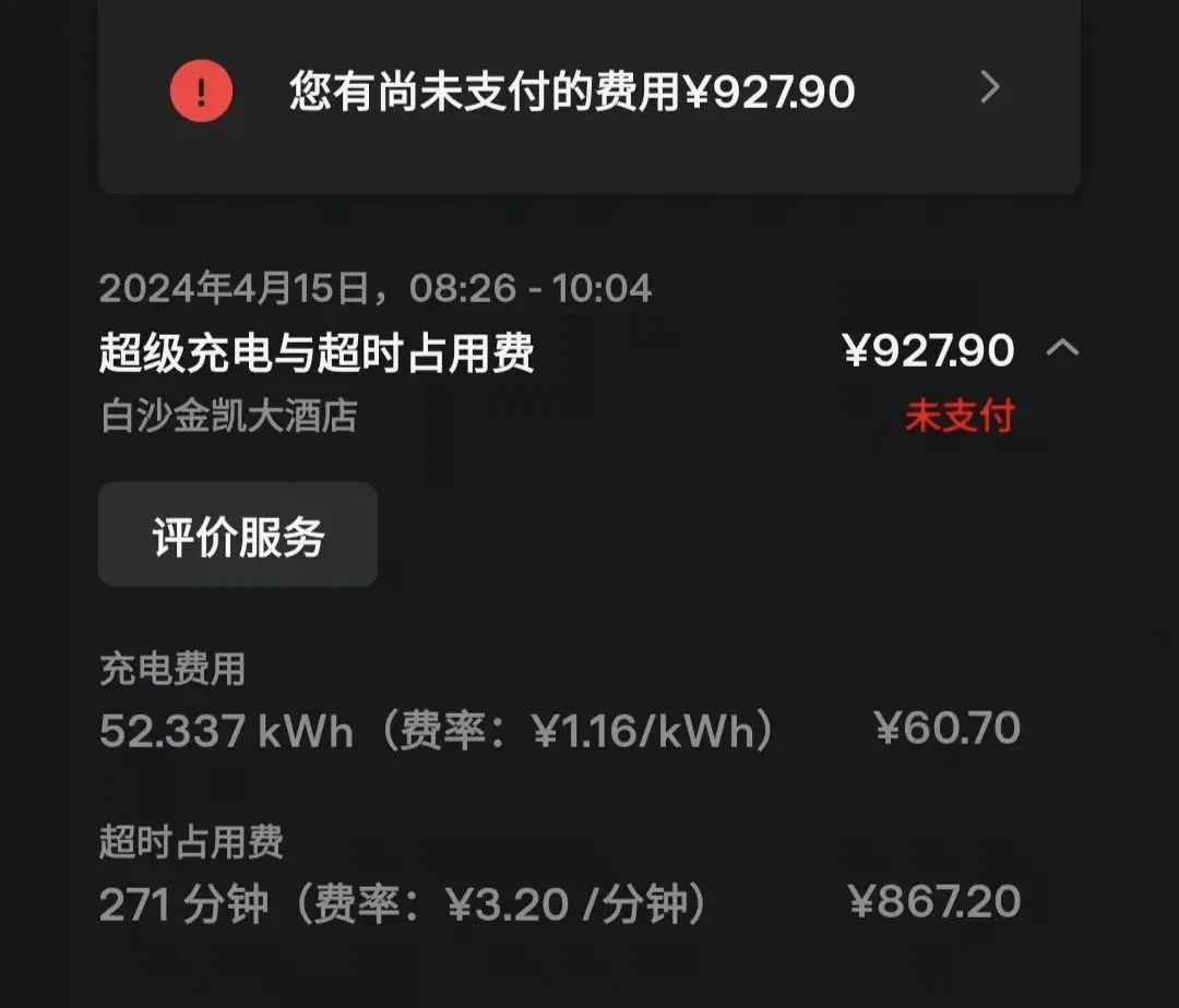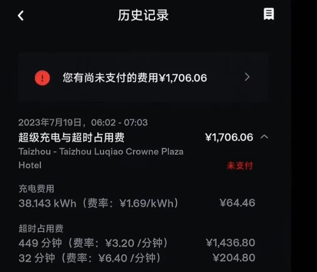 不过,不少特斯拉车主反馈,其充电桩的超时占用费标准过高,而且没有封顶上限。有车主直言,自己使用超级充电桩充电,充电费用60.7元,超时占用费867.2元,累计收取了900多元。还有车主晒出账单显示,充电和超时占用费共计1706.06元,其中充电费用仅为64.46元,超时占用费高达1641.6元……