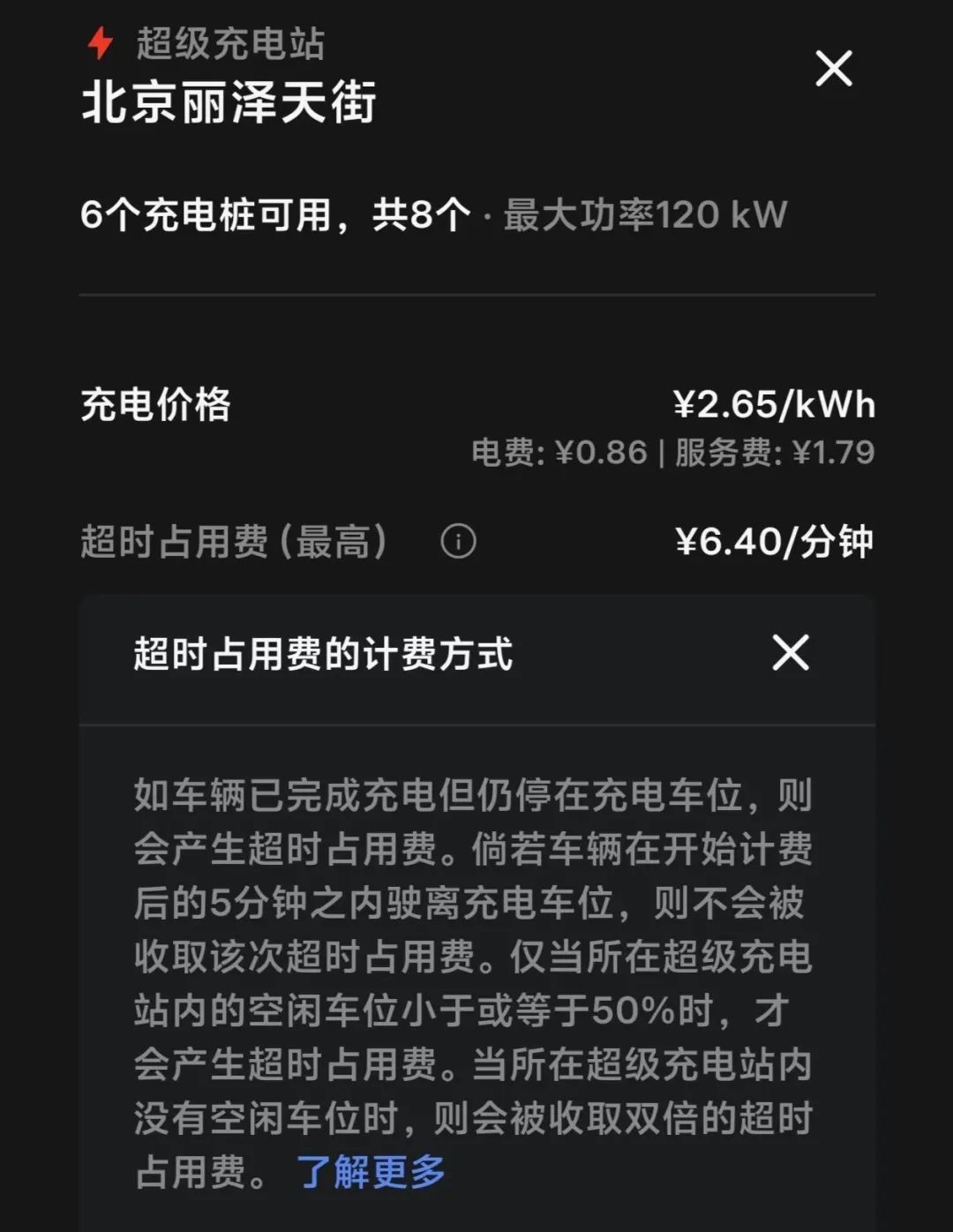 而特斯拉的超时占用费收取标准则最高。特斯拉App显示,如车辆已完成充电但仍停在充电车位,则会产生超时占用费。倘若车辆在开始计费后的5分钟之内驶离充电车位,则不会被收取该次超时占用费。仅当所在超级充电站内的空闲车位小于或等于50%时,才会产生超时占用费。当所在超级充电站内没有空闲车位时,则会被收取双倍的超时占用费。超时占用费最高为6.4元/分钟。