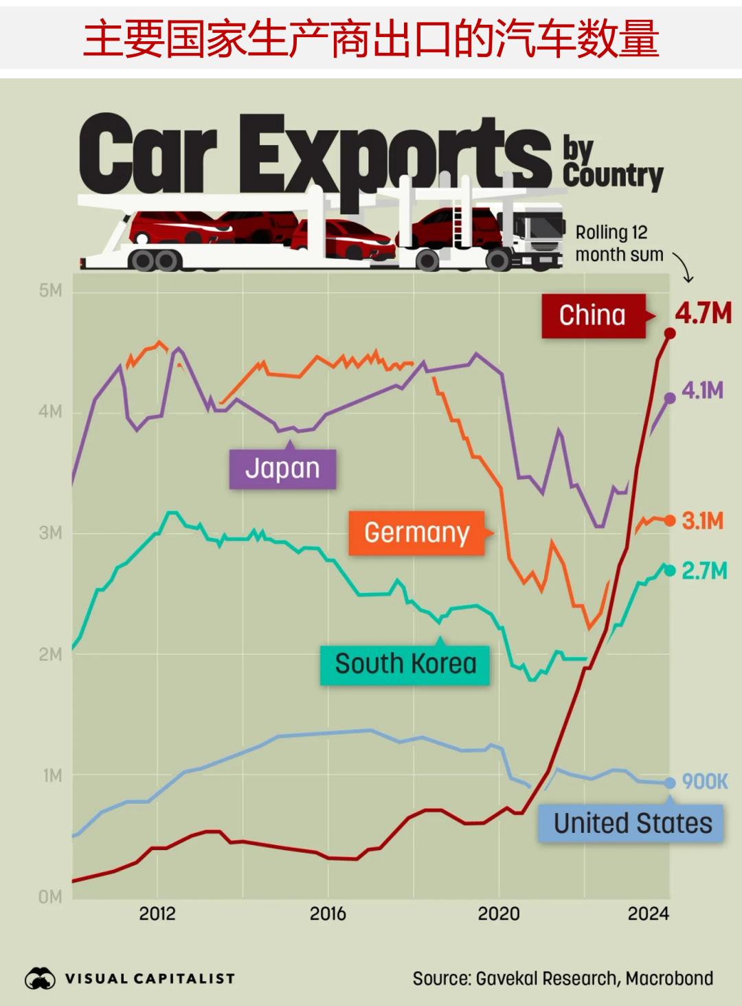从 2021 年的 200 万辆,一路狂飙,到 2024 年直接干到了 500 多万辆,硬生生把日本拽下马,成了全球第一。其中新能源车贡献了五分之一,可谓功不可没。