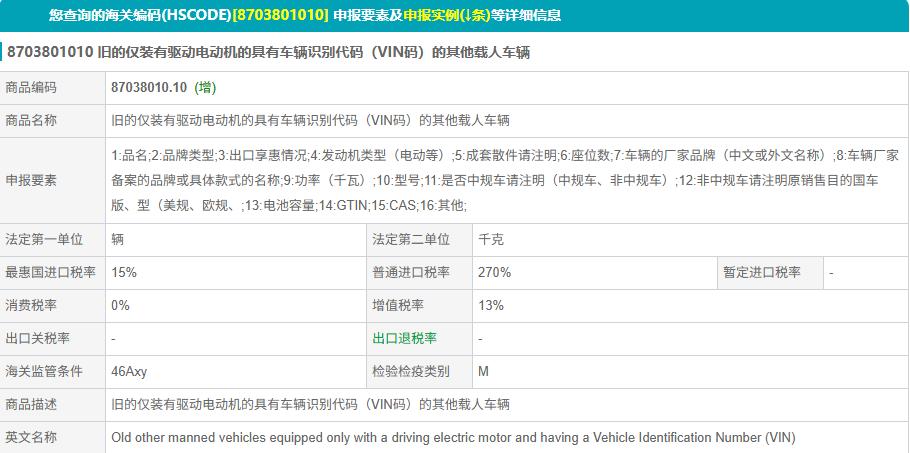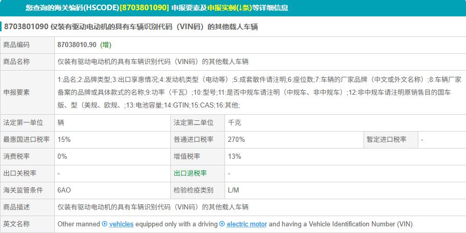 脖子哥翻阅了具体的海关编码,这次新增了具有识别代码的纯电车 (编码:87038010.90) 这一类目,与原来二手纯电车(编码:87038010.10)并不一样。