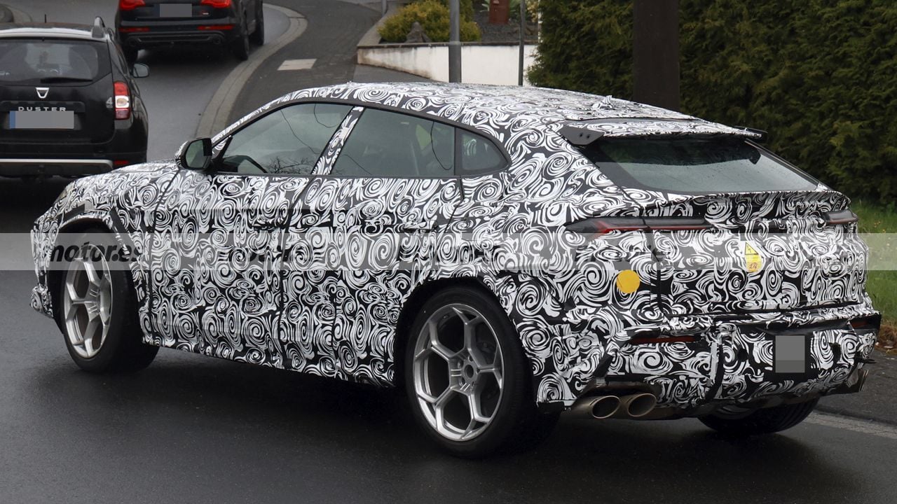 车辆尾部的改动更具看点。除了四出排气,Urus SE Performante 采用了双扰流设计:一处位于尾灯上方,为 SE 标配;另一处位于尾门顶部,造型更为激进。后扰流板、车顶及第二扰流板均采用贴膜包覆,预示其最终将使用碳纤维材质。排气口间的空气扩散器同样将由碳纤维打造。