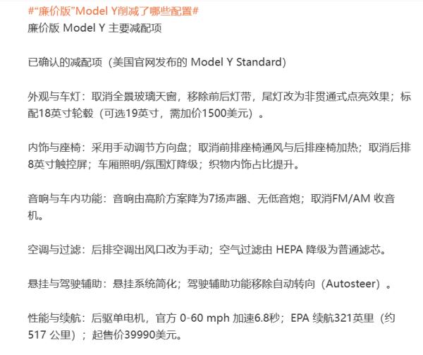 有汽车博主整理了ModelY标准版的减配项,除了减少车内配置和功能之外,汽车续航“缩水”了,也没有配备特斯拉的Autopilot自动辅助驾驶,仅搭载了交通感知巡航控制系统。
