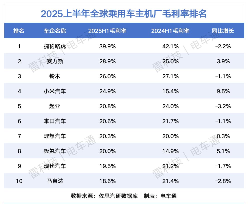 日前,“佐思汽研”公布了今年上半年全球乘用车主机厂毛利率排行榜,其中捷豹路虎以 39.9% 的毛利率遥遥领先,其中赛力斯和小米汽车分别以 28.9% 和 24.9% 的毛利率位列第二名和第四名,理想、极氪同样进入毛利率排名前十名,超越丰田、梅赛德斯-奔驰、大众集团等传统知名大厂。