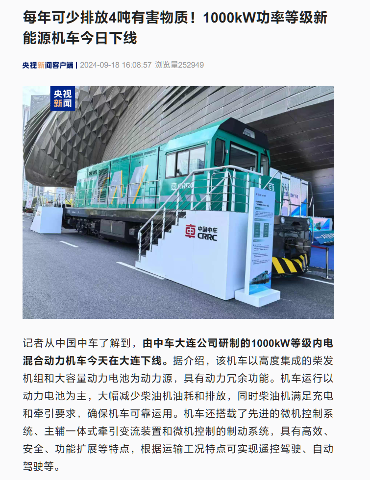IT之家 9 月 18 日消息,据央视新闻报道,中车大连公司研制的 1000kW 等级内电混合动力机车今天在大连下线。