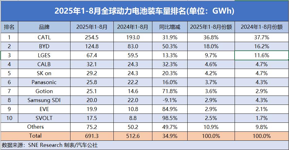 从全球装机量1~8月排名来看,与2024年同期相比,TOP10公司中,宁德时代、比亚迪、LGES、中创新航、SK On的TOP5排名不变,总的来说,格局算是比较稳定。