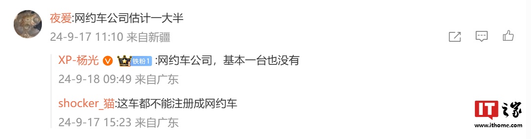IT之家 9 月 18 日消息,有博主于 9 月 16 日发文讨论小鹏 MONA M03 汽车销量情况,网友评论回复称“网约车公司估计一大半”,小鹏 MONA 系列产品负责人杨光对该说法进行了否认“网约车公司,基本一台也没有”。