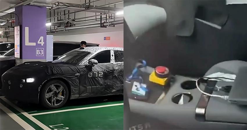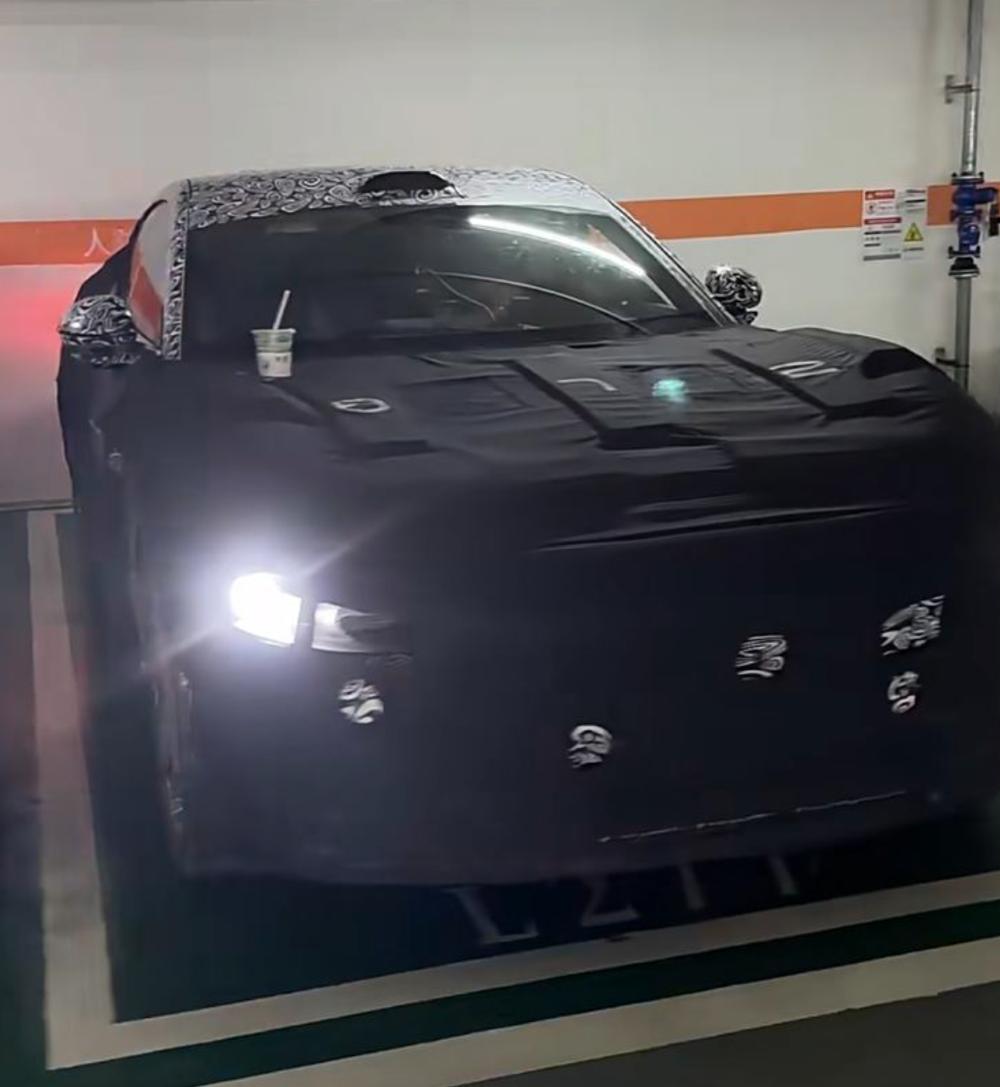 从车身整体来看,可以看到其车长较长,车身占满了整个停车位,从侧面还可以看到图中的伪装车配备了黄色的刹车卡钳。