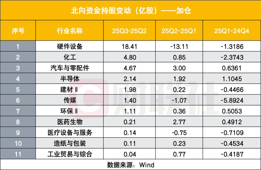 从加仓方向看,科技制造板块成北向资金加仓核心。硬件设备行业单季加仓18.41亿股,扭转前两季减持态势;化工行业加仓4.80亿股,延续二季度加仓趋势;汽车与零配件行业加仓4.67亿股,实现连续三季增持。此外,半导体、建材Ⅱ、传媒等行业也获不同程度加仓。