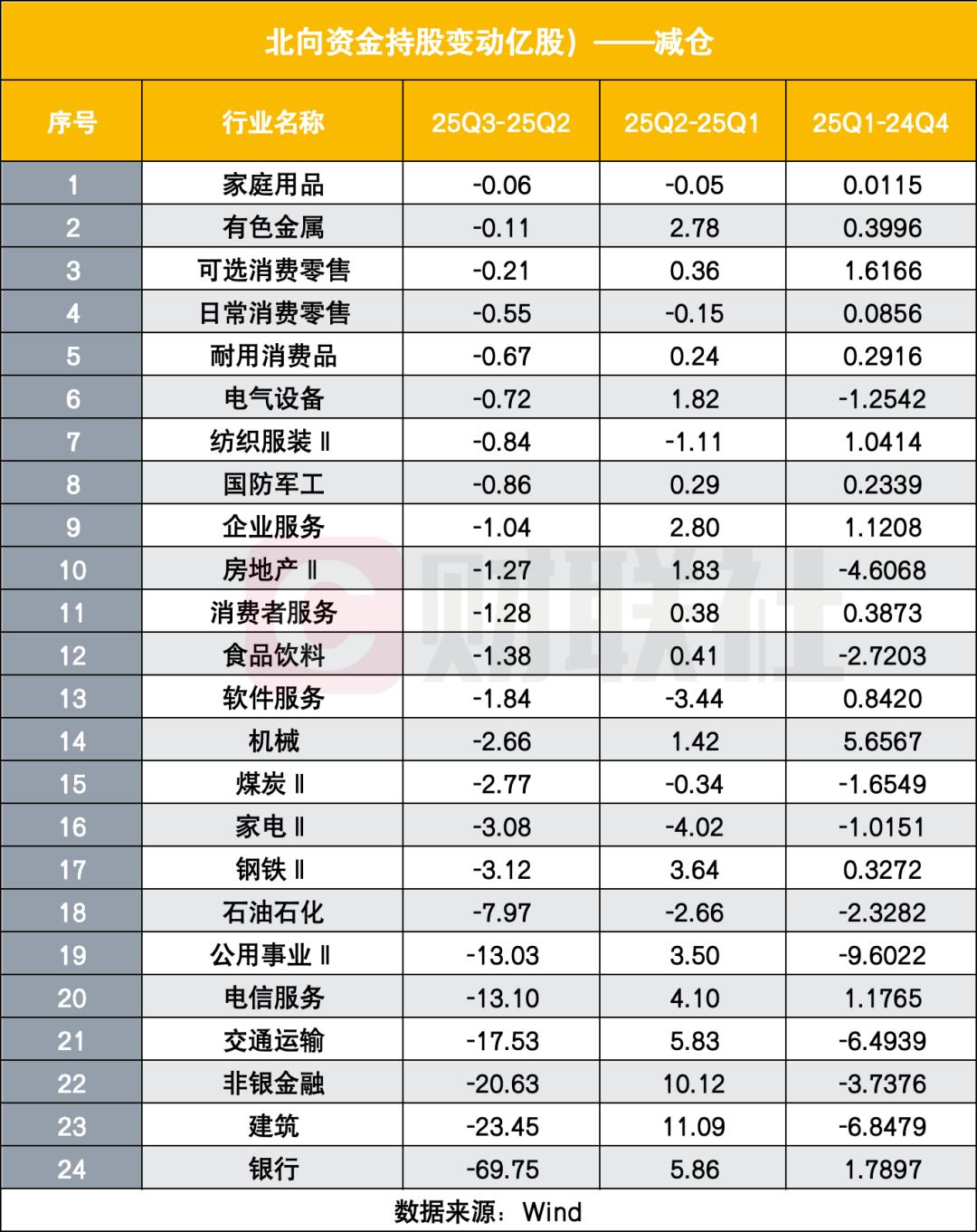 与科技制造板块的强势加仓形成鲜明对比,三季度北向资金对金融、基建相关行业的减持力度尤为显著。