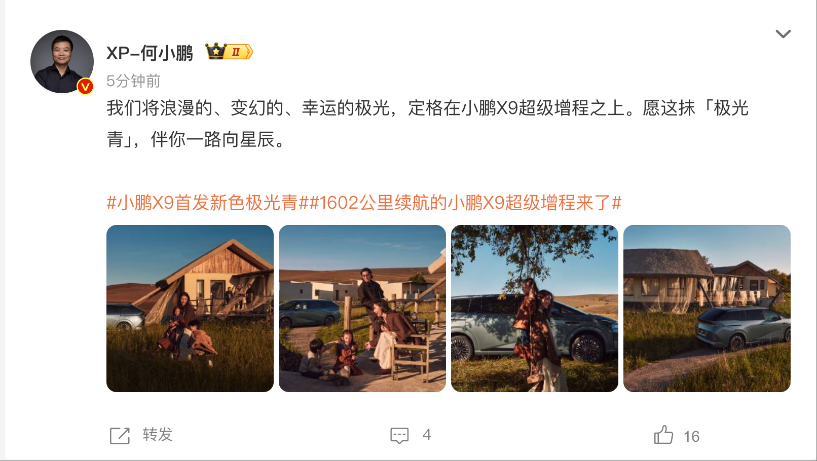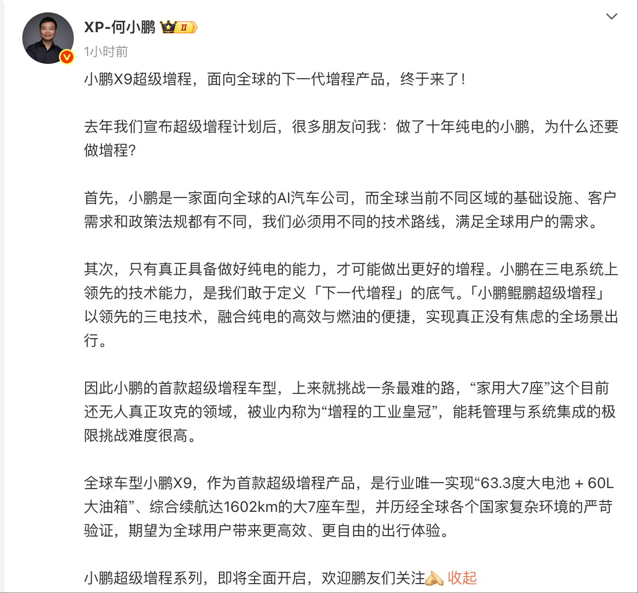稍早前,何小鹏发文称,小鹏X9超级增程,面向全球的下一代增程产品,终于来了。