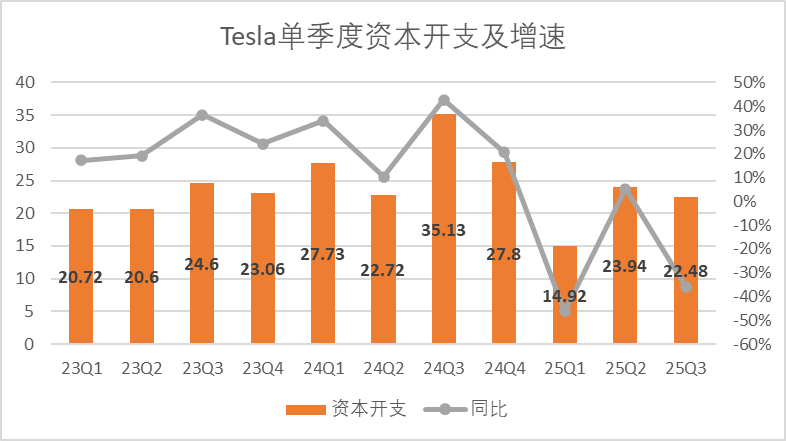 三季度特斯拉的资本开支录得22.48亿,如果仅从单季度来看,环比二季度下滑了约6%,同比去年三季度下滑了约36%,整体来看资本开支的增速放缓。