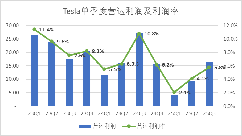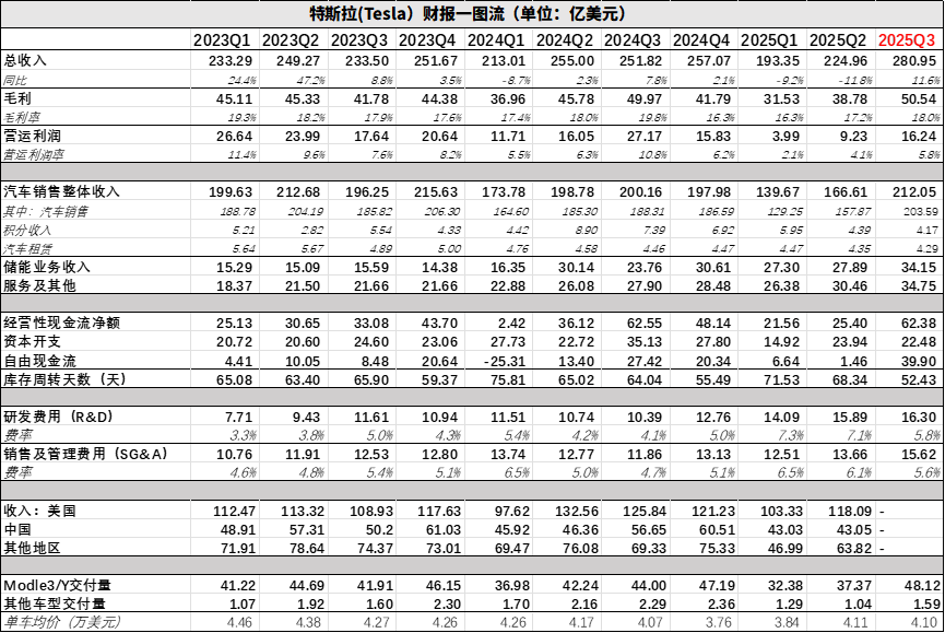 美东时间10月22日美股盘后,特斯拉公布了2025年第三季度的财务报告,录得总营收280.95亿美元,明显高于分析师预期的264亿美元;营运利润16.24亿美元,也略高于分析师预测15.8亿美元;Non-Gaap下EPS录得0.5美元,略低于分析师预测0.55美元。