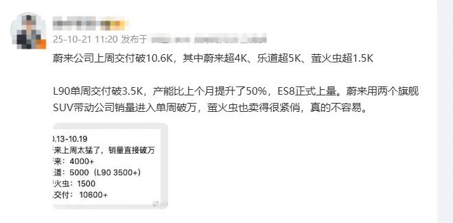 该博主还表示,乐道L90单周交付量突破3500辆,创历史新高,产能较上月提升50%;全新ES8也正式进入“上量”阶段。