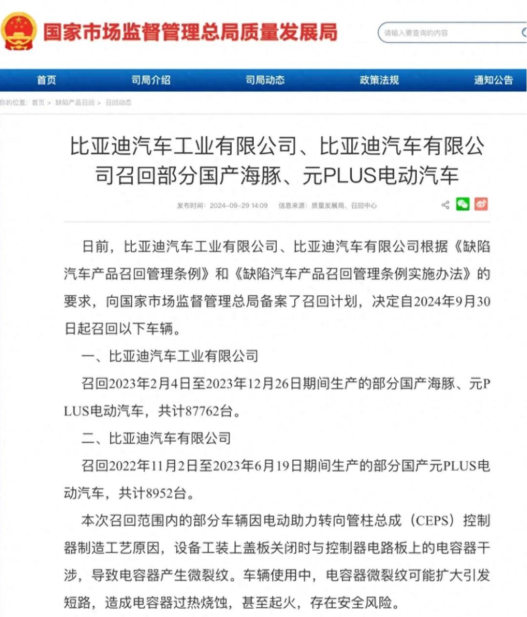 2024年9月,比亚迪因存在起火风险召回超9万辆国产海豚和元PLUS电动汽车。