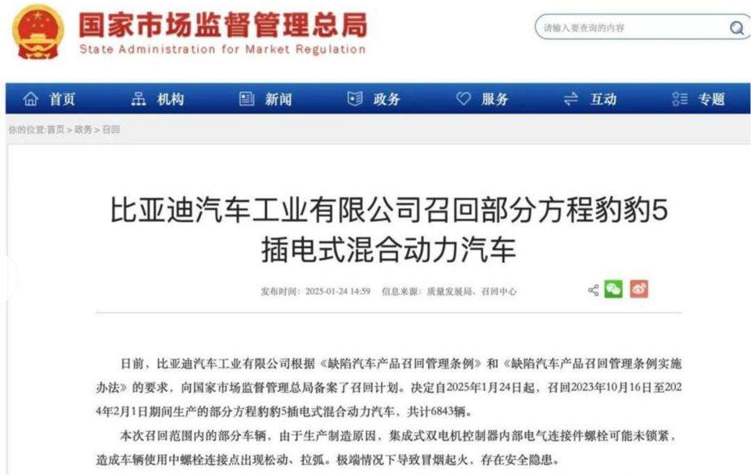 2025年初,比亚迪还曾因集成式双电机控制器螺栓未锁紧问题,召回6843辆方程豹豹5。