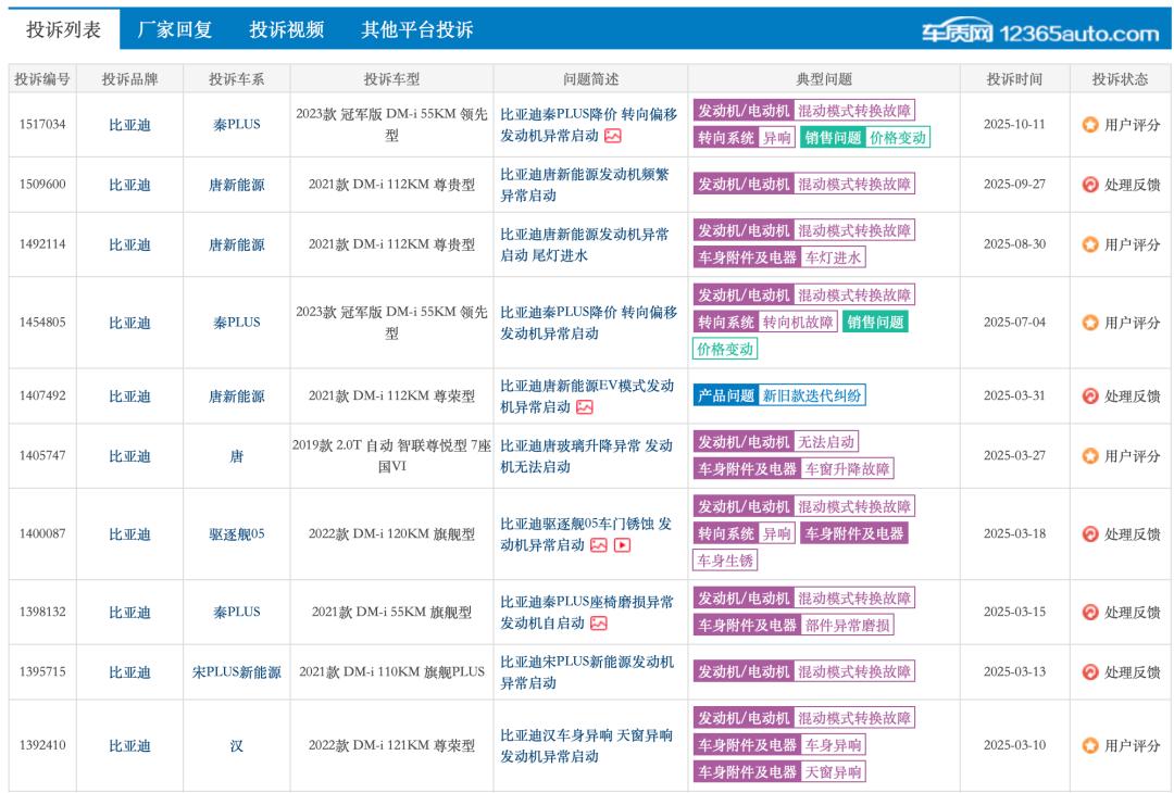 比如,众多消费者反映的比亚迪DM-i(插电式混合动力)车型发动机异常启动问题就是典型例证。多款DM-i热销车型,如秦PLUS、宋PLUS/PRO、汉等遭到大量车主投诉,反映车辆的发动机在特定情况下会异常启动。