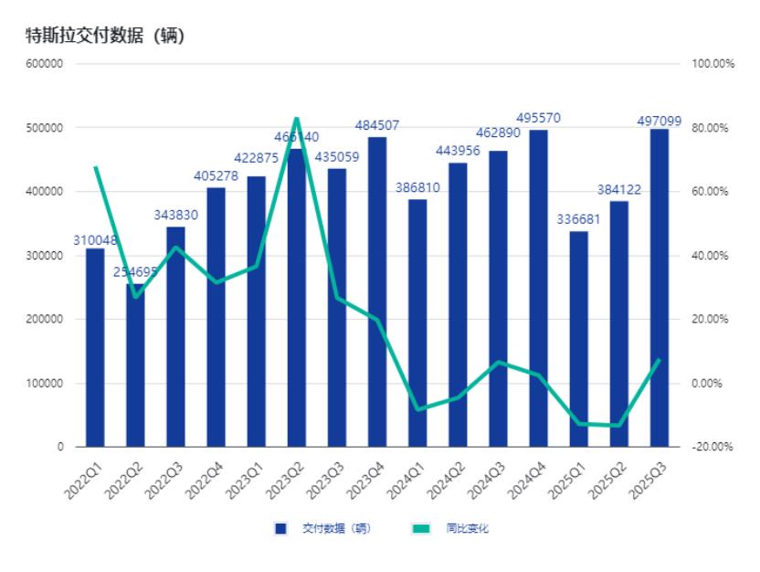 10月23日,特斯拉发布了2025年第三季度的财报。营收281亿美元,从上季度的同比下跌11.78%到本季度的增长12%。在49.7万辆这个创新高的季度交付数据之下,增速达到7.39%,从负转正。