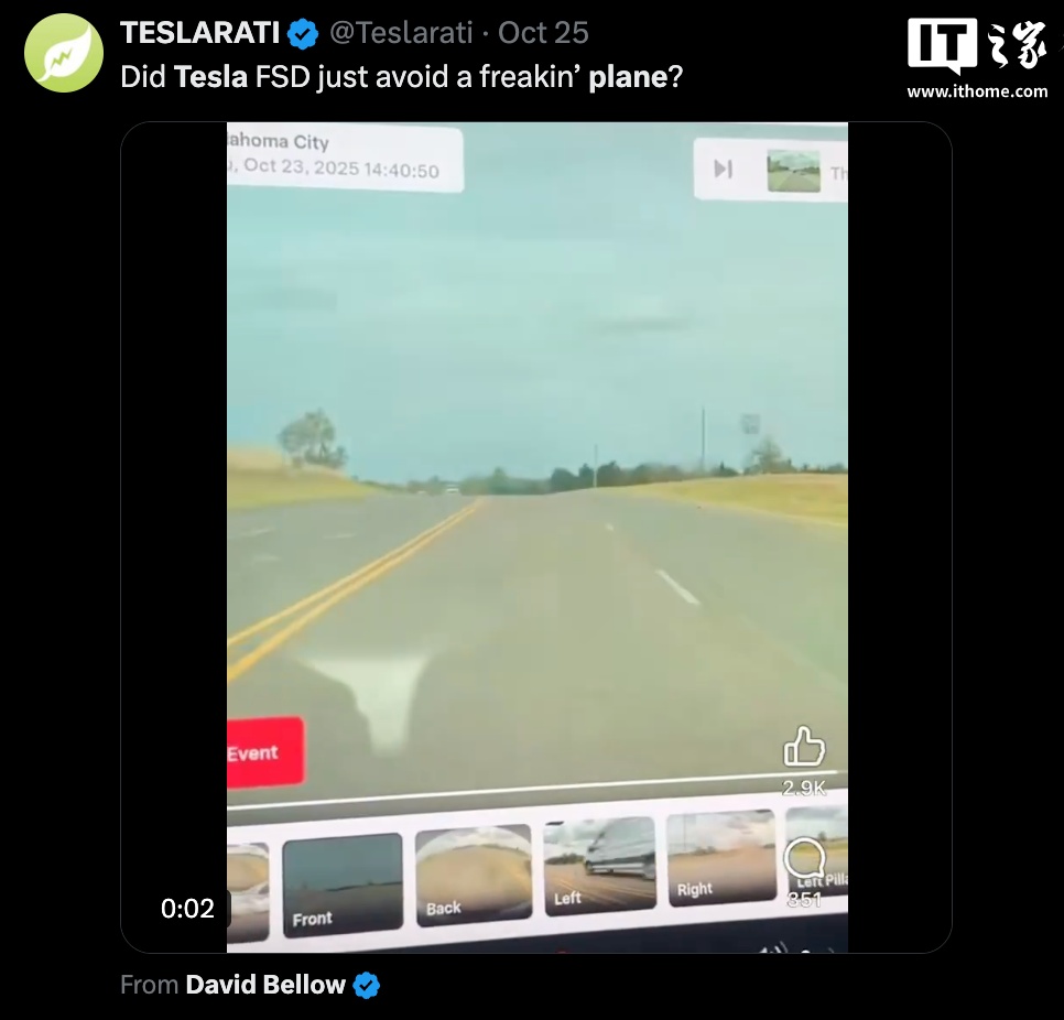 IT之家 10 月 27 日消息,近日有不少海外网友声称一辆启用 FSD 功能的特斯拉汽车成功避让了一架坠落至道路附近的飞机,引发热议。然而,涉事车辆驾驶员已证实,当时该车并未开启 FSD。