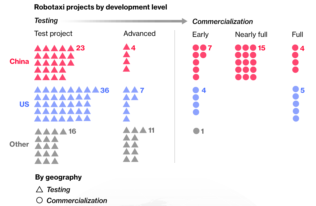 根据彭博新能源财经的分析,百度萝卜快跑、文远知行与小马智行的自动驾驶出租车项目数量已超过美国同行,这些项目正从测试阶段逐步进入不同的商业化阶段。虽然大部分进展主要集中于国内市场,但中国公司已在迪拜、阿布扎比和新加坡等地建立业务,并计划进军德国、英国和其他欧洲市场。