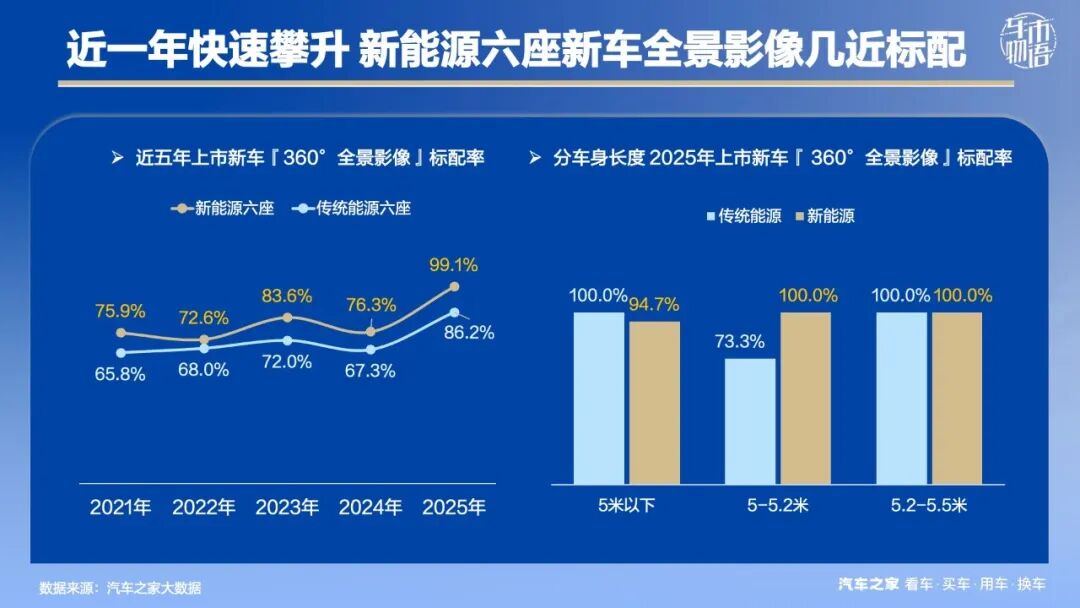 相比辅助泊车入位,360°全景影像更早应用于量产车,也更为成熟,能够非常清晰有效地辅助驾驶员完成泊车。至2025年,新能源六座新车标配率达到了99.1%。传统能源表现也不错,达到了86.2%。分尺寸来看,新能源新车在5米以下标配率尚有欠缺,而传统燃油的问题更亟待解决。5-5.2米的新车标配率仅73.3%。