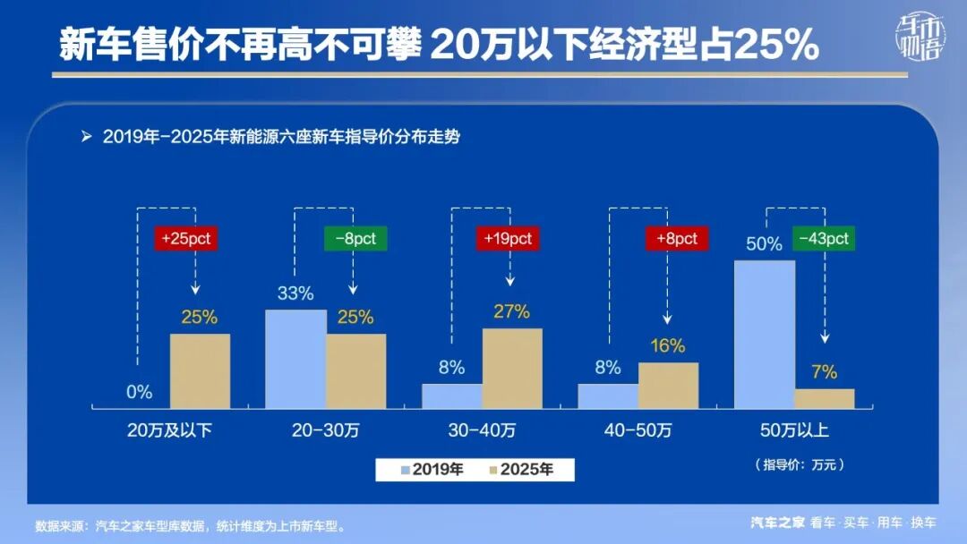 至2025年,新车的价格分布相对更为合理。主力价格区间下探至20-40万,其中20-30万占比25%,30-40万占比27%,合计超五成。20万以下经济型细分市场不但实现了0的突破,占比还达到了25%的较高水平。