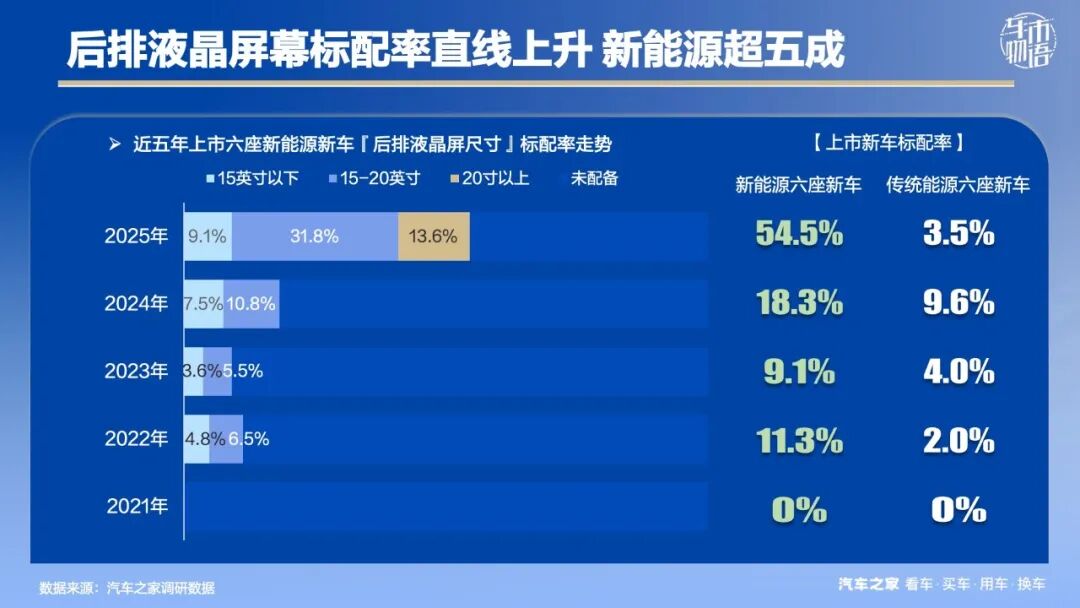 2021年标配率均为0%,至2025年六座新能源新车标配率达到了54.5%,但传统能源仅为3.5%。尺寸方面,新能源新车也是十分“豪横”。至2025年,后排液晶屏尺寸超过20寸的占比达到13.6%,一些新车还配备了车内投影,尺寸更大,俨然一个移动的小电影院。