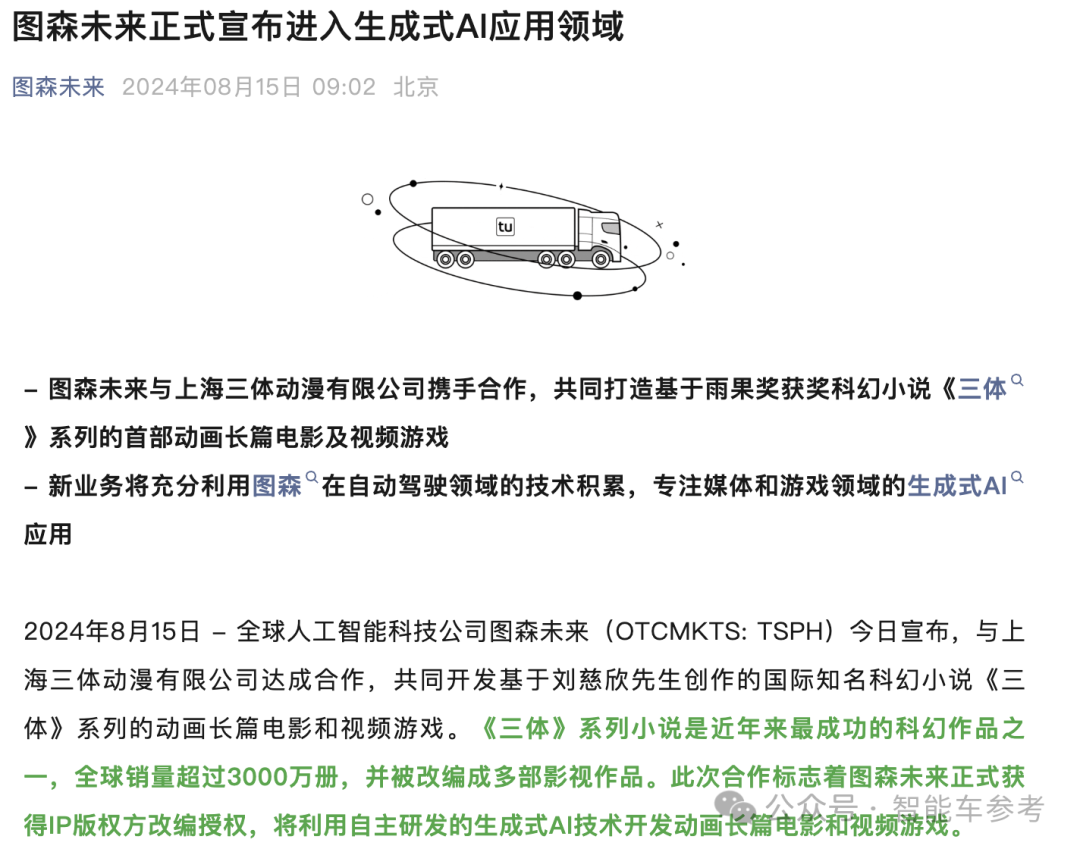 因此,根据公司章程和治理制度,图森集团于 2024 年 8 月 12 日召开董事会,正式批准了建立生成式 AI 新业务方向,正式进入动漫电影和游戏行业。8 月 15 日,公司正式宣布与三体宇宙的相关 IP 授权与合作。