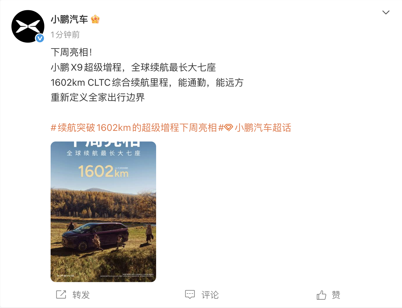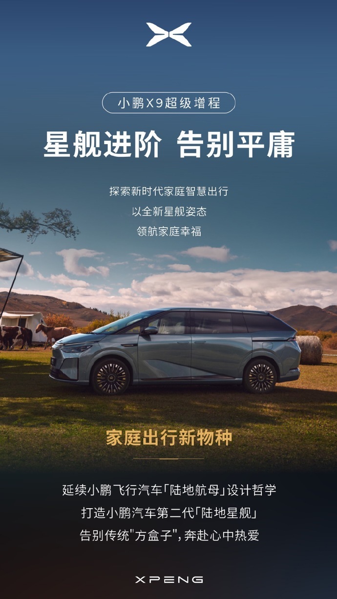 凤凰网科技讯 10月31日,小鹏汽车官方宣布,小鹏X9超级增程版将于下周亮相。新车CLTC综合续航里程达1602km,官方宣称“全球续航最长大七座”。