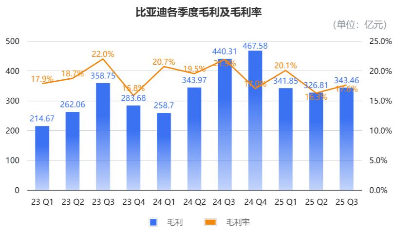 第三季度,比亚迪的综合毛利率为17.6%,环比上涨了1.3个百分点,意味着利润压力正在缓解。