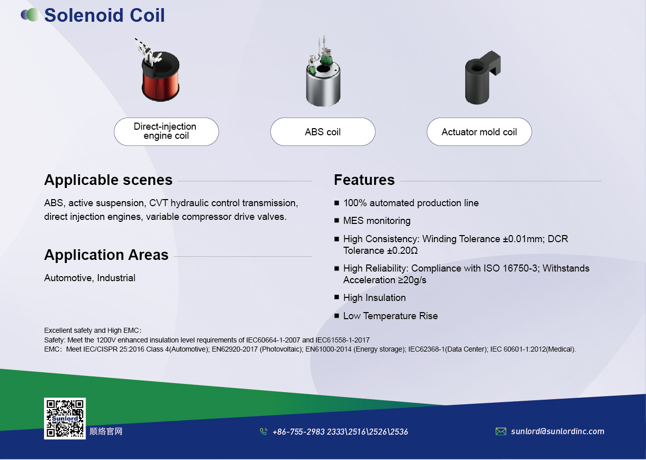 本次推出的电磁阀线圈是实现工业自动化、汽车智能化等的核心执行元件,广泛应用于汽车制动系统、变速器和底盘与悬挂系统等,以及工业自动化与过程控制等领域。顺络在关键性能指标上实现显著突破,为制动控制系统提供更卓越的执行保障。