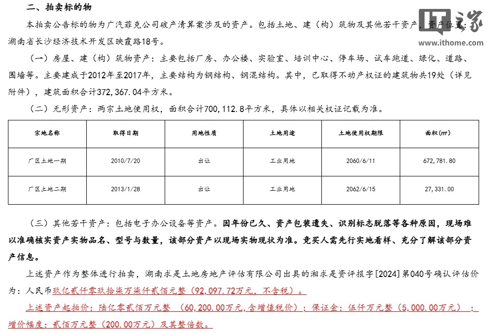 IT之家查询获悉,广汽菲克长沙工厂首次拍卖于 7 月 20~21 日进行,起拍价超 19.15 亿元,但因无人出价而流拍。