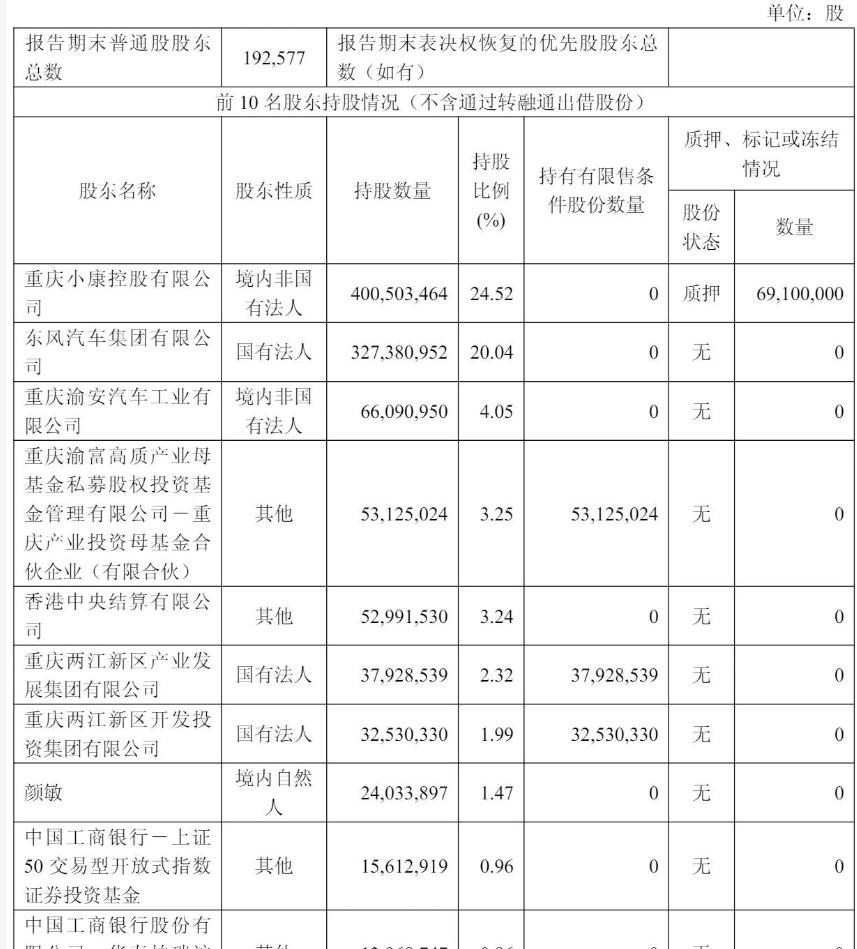 重庆小康控股为赛力斯的第一大股东,持股24.52%,第二大股东东风汽车公司持股20.04%。