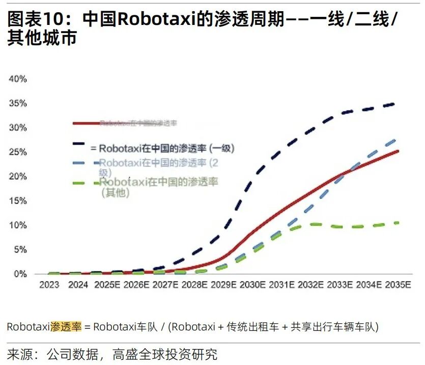 高盛在研报中认为,到2035年,中国将有百万规模的出租司机迎来退休。随着人口结构变化,以及年轻人的兴趣下降,司机短缺问题将凸显。届时,中国市场的Robotaxi渗透率将达到25%左右。