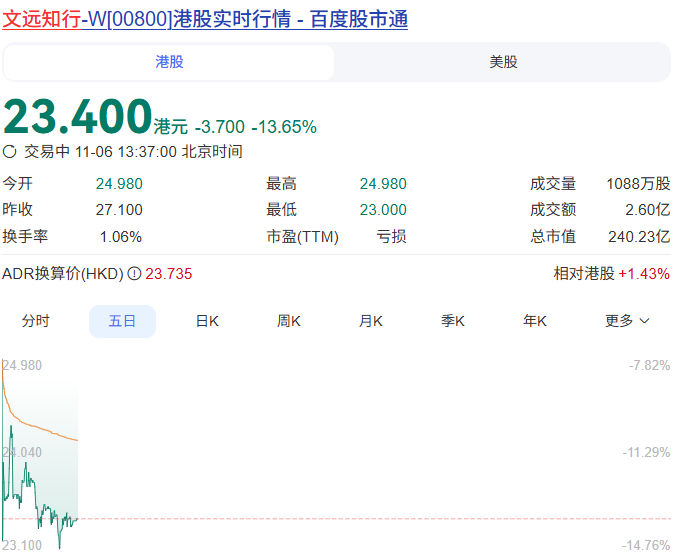11月6日,文远知行正式登陆港交所,该只股票发行价为27.1港元/股,但上市首日破发,截至发稿价格为23.4港元/股,较发行价跌幅达13.65%,总市值为240.23亿港元。