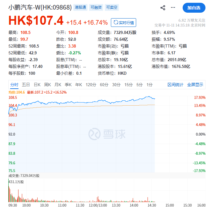 凤凰网科技讯 11月11日,截至发稿,小鹏汽车港股上涨16.74%,报107.4港元;美股昨日收盘涨16.15%,盘后又上涨1.31%,报26.04美元。受对其机器人的乐观情绪提振,过去一周,小鹏汽车累涨26.41%。