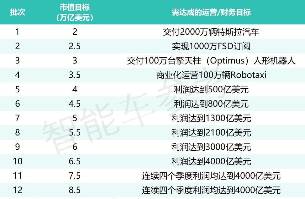 以1000亿美元(约7130亿元)市值为起点,每批要求特斯拉市值涨500亿美元,最终市值要达到6500亿美元。